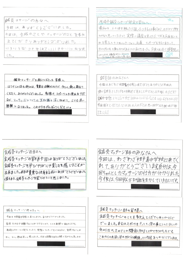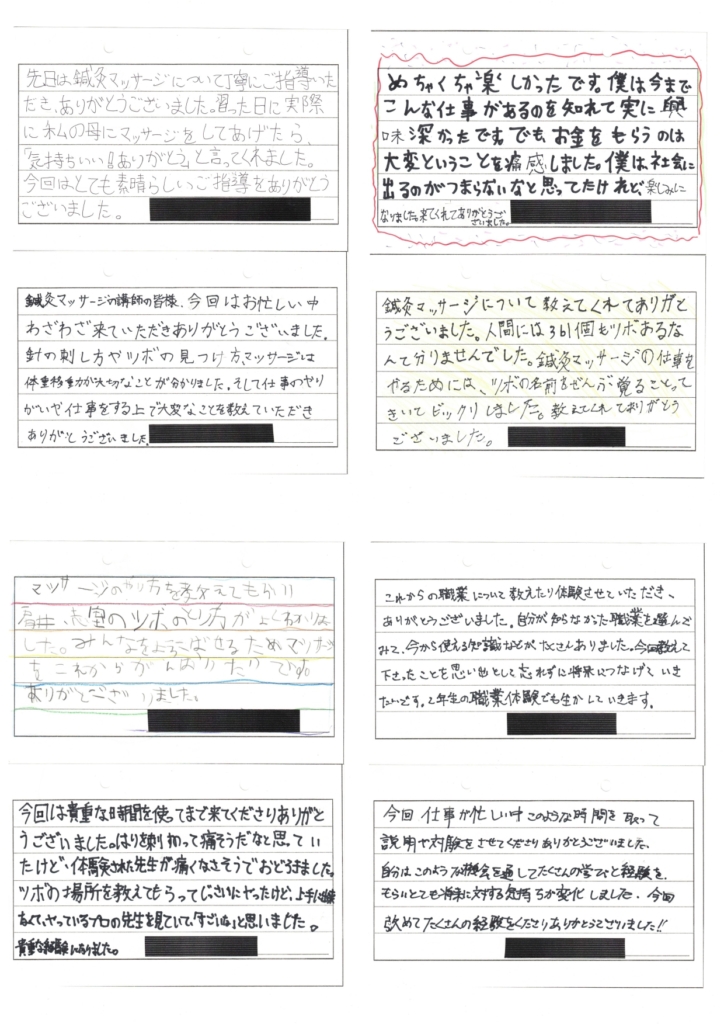 真面目に楽しく講義、実技体験を受けてくれました。 将来、進路を考えるときに、鍼灸マッサージ師を志してほしく願っております。 足立理事